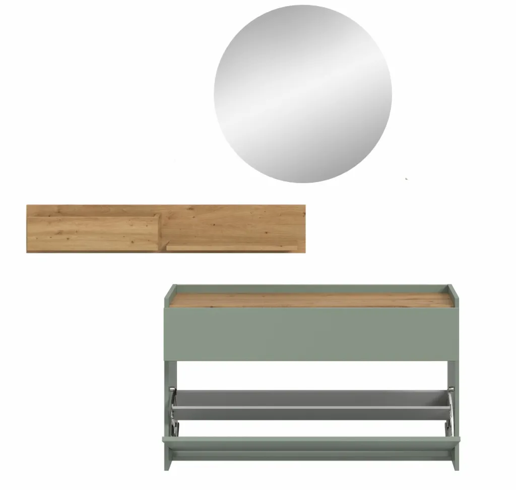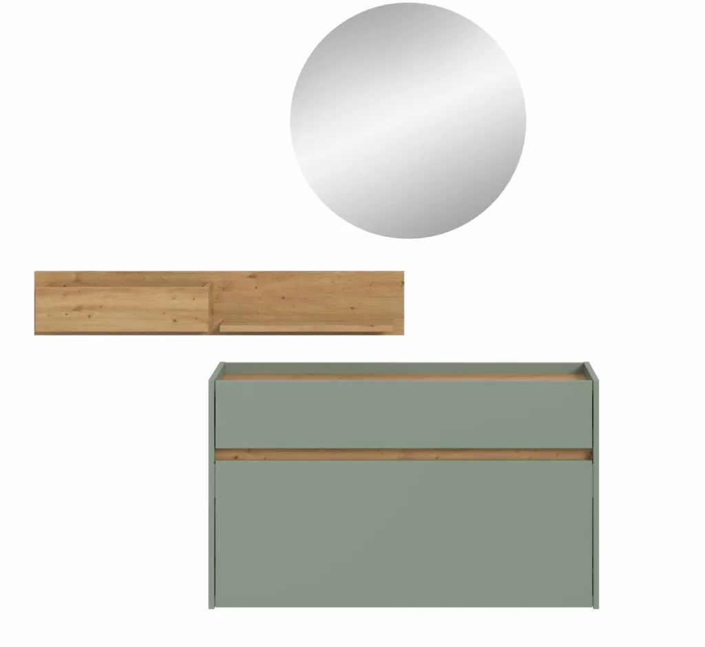 Façade : ton sauge et décor chêne Artisan / miroir
