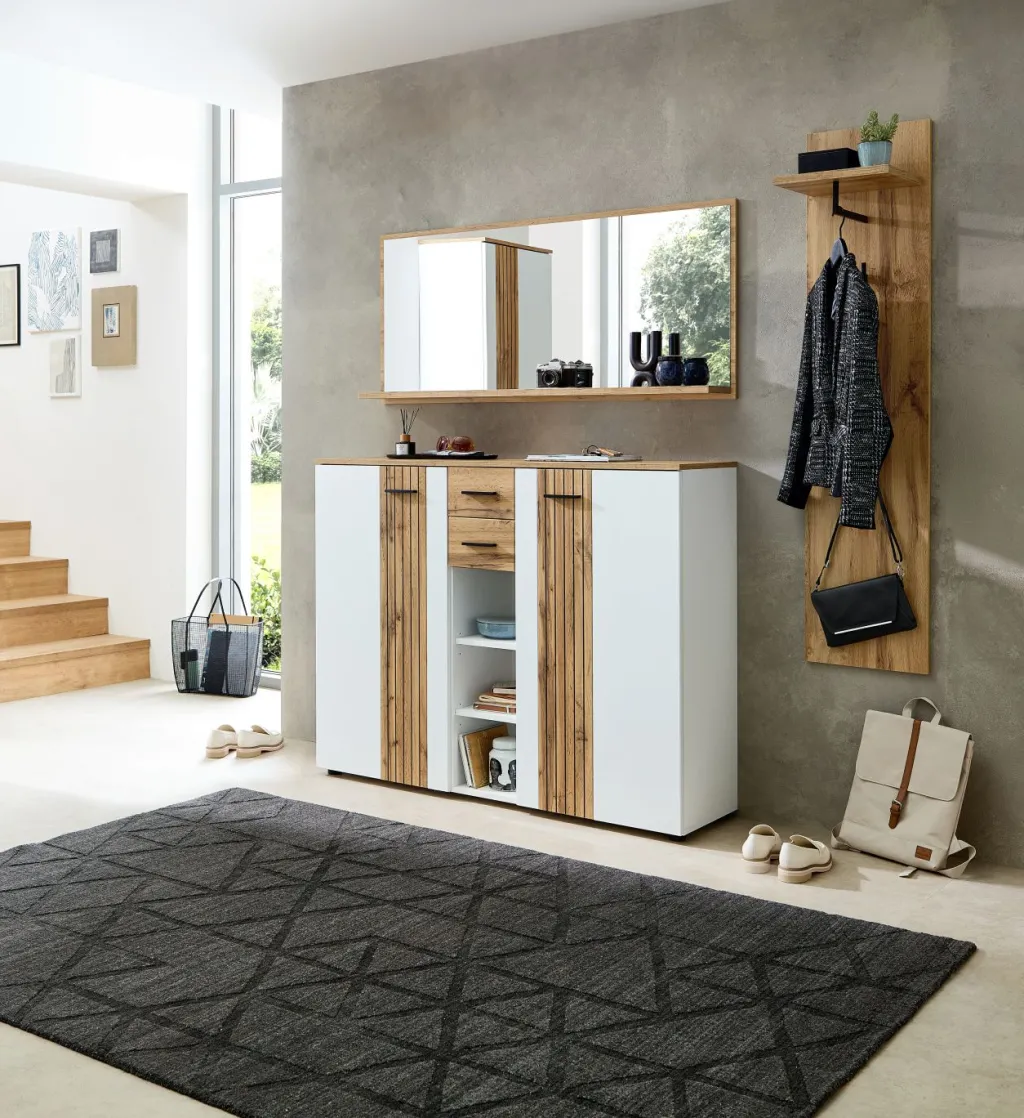 1 meuble à chaussures avec 3 casiers ouverts, 2 portes, 2 tiroirs et 10 tablettes