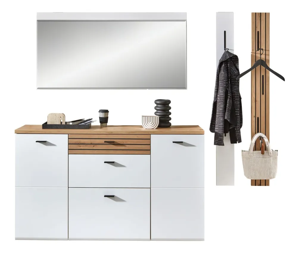 1 meuble à chaussures à suspendre avec 2 portes, 2 tiroirs, 1 abattant avec rangement pour chaussures et 8 tablettes
