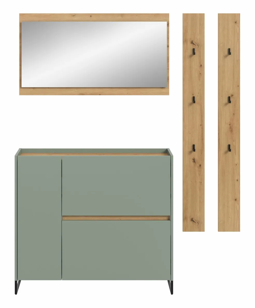 Façade : ton sauge et décor chêne Artisan / miroir