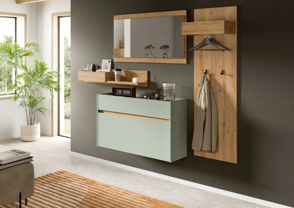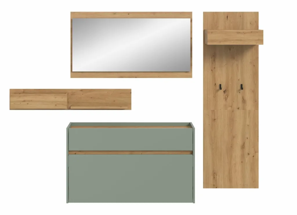 Façade : ton sauge et décor chêne Artisan / miroir