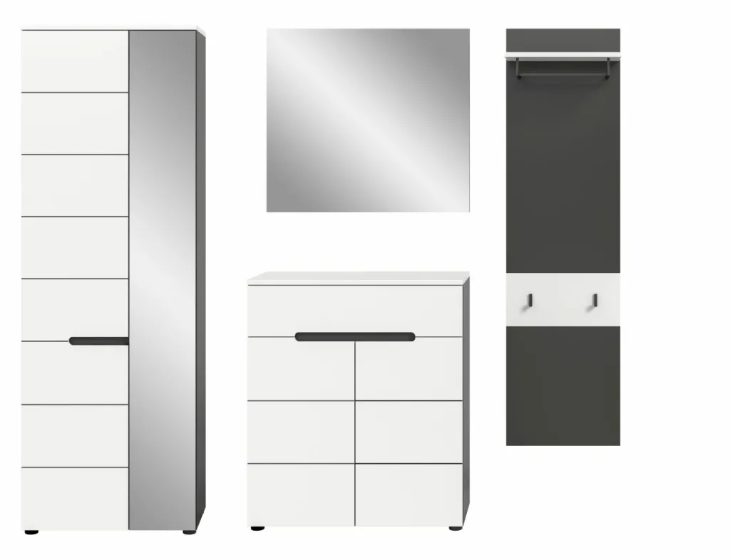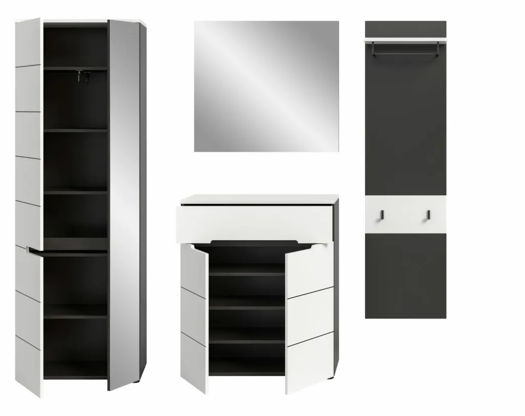 1 armoire d’entrée avec 2 portes (dont 1 porte avec miroir), 1 tablette fixe, 1 barre de penderie et 4 tablettes amovibles