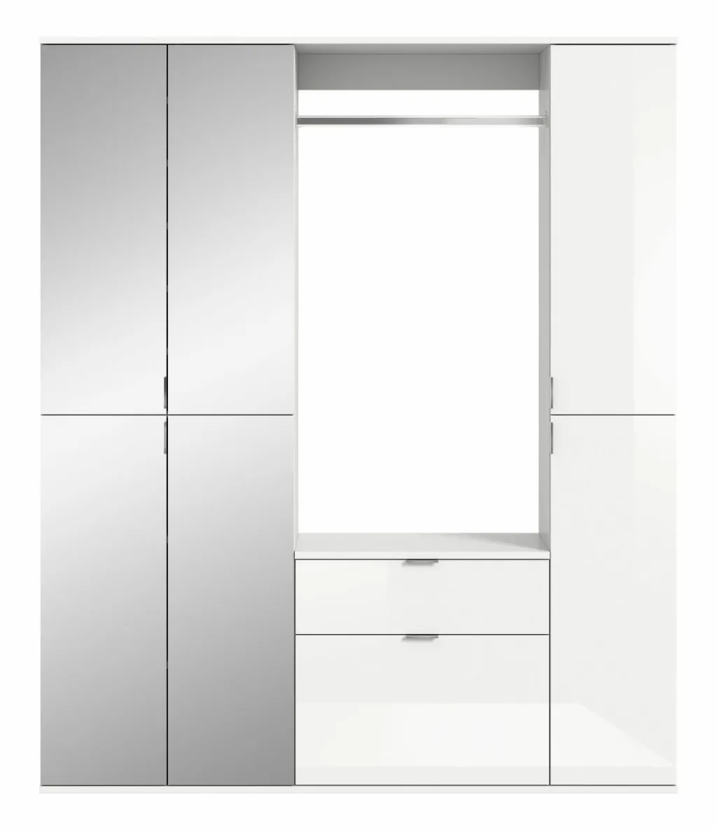 1 armoire d’entrée comprenant 2 portes avec miroir, 7 tablettes amovibles, 1 tablette fixe et 1 barre de penderie