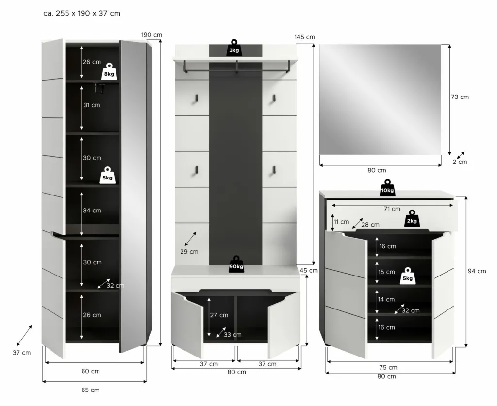 1 armoire d’entrée avec 2 portes (dont 1 porte avec miroir), 1 tablette fixe, 1 barre de penderie et 4 tablettes amovibles