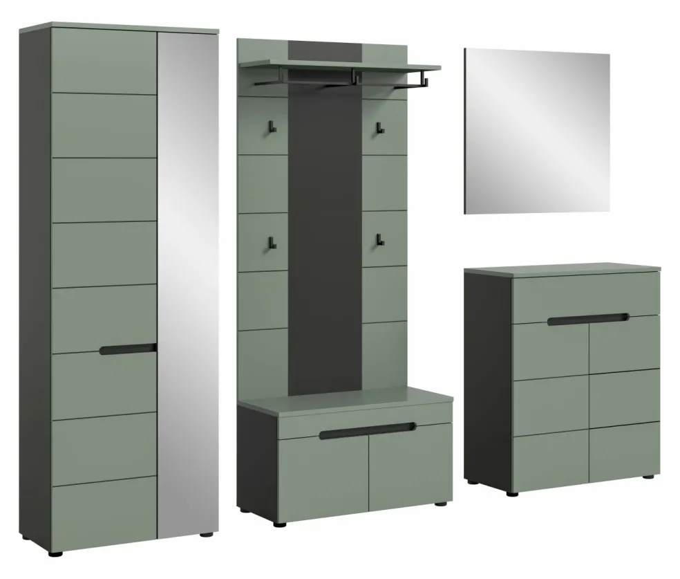 1 armoire d’entrée avec 2 portes (dont 1 porte avec miroir), 1 tablette fixe, 1 barre de penderie et 4 tablettes amovibles