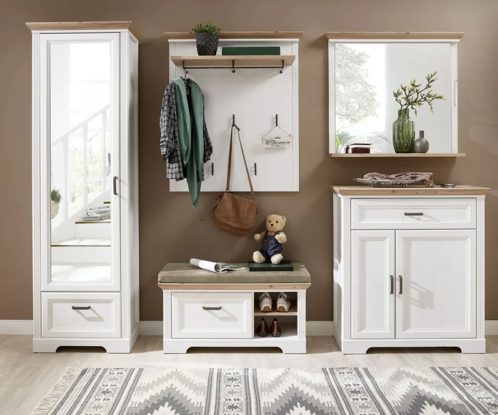 1 banc à chaussures avec 1 tiroir, 2 casiers ouverts, coussins d’assise inclus