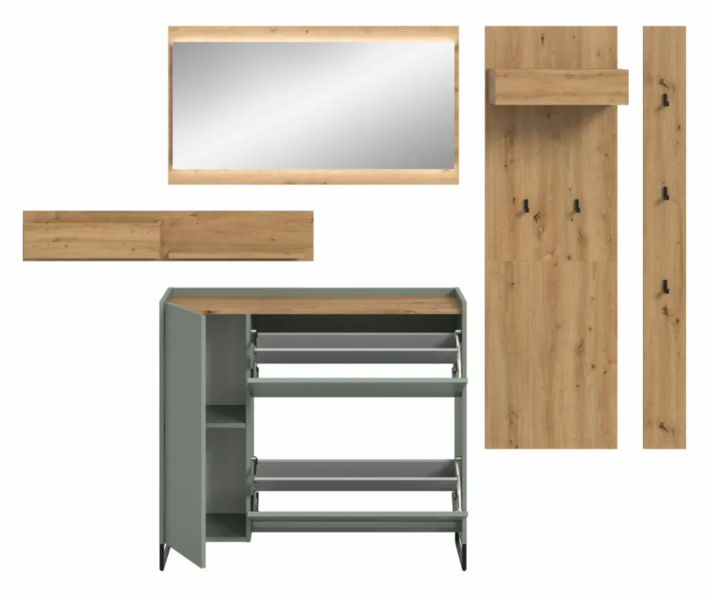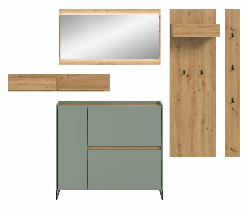 Façade : ton sauge et décor chêne Artisan / miroir