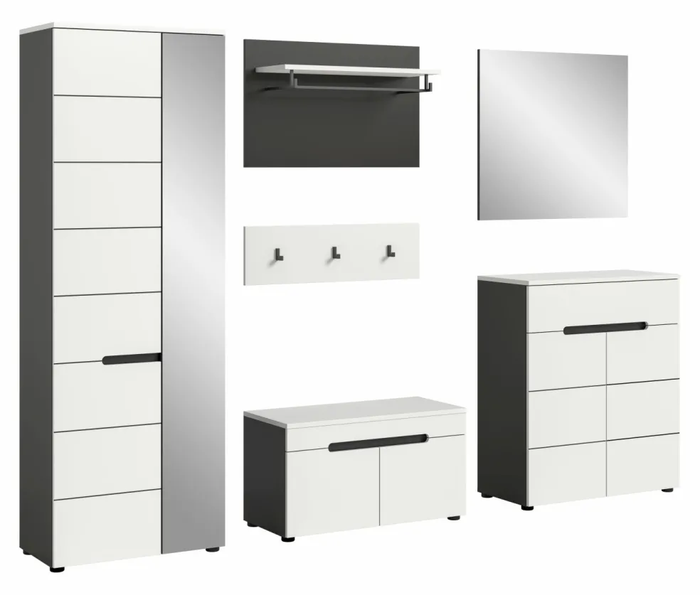 1 armoire d’entrée avec 2 portes (dont 1 porte avec miroir), 1 tablette fixe, 1 barre de penderie et 4 tablettes amovibles
