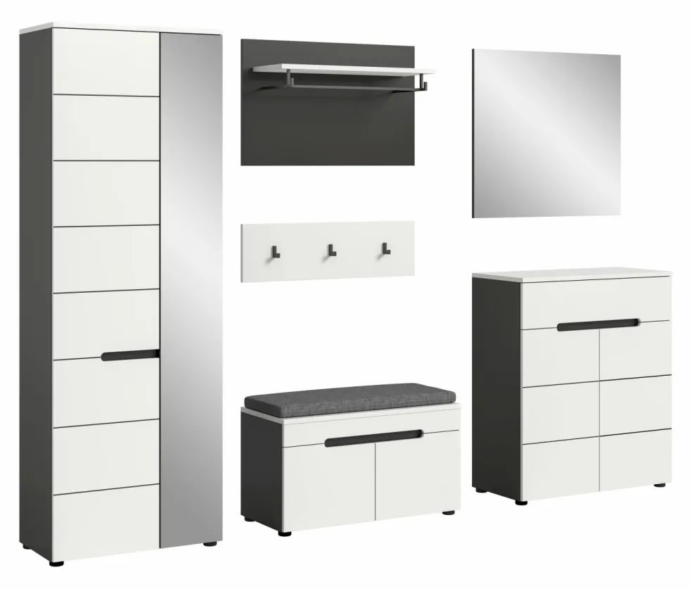 1 armoire d’entrée avec 2 portes (dont 1 porte avec miroir), 1 tablette fixe, 1 barre de penderie et 4 tablettes amovibles