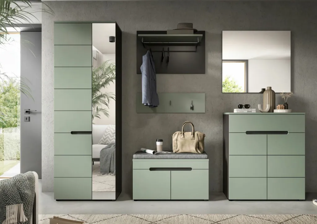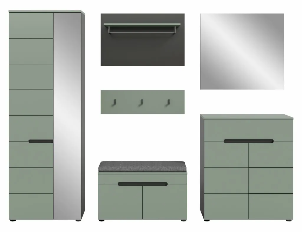 1 armoire d’entrée avec 2 portes (dont 1 porte avec miroir), 1 tablette fixe, 1 barre de penderie et 4 tablettes amovibles