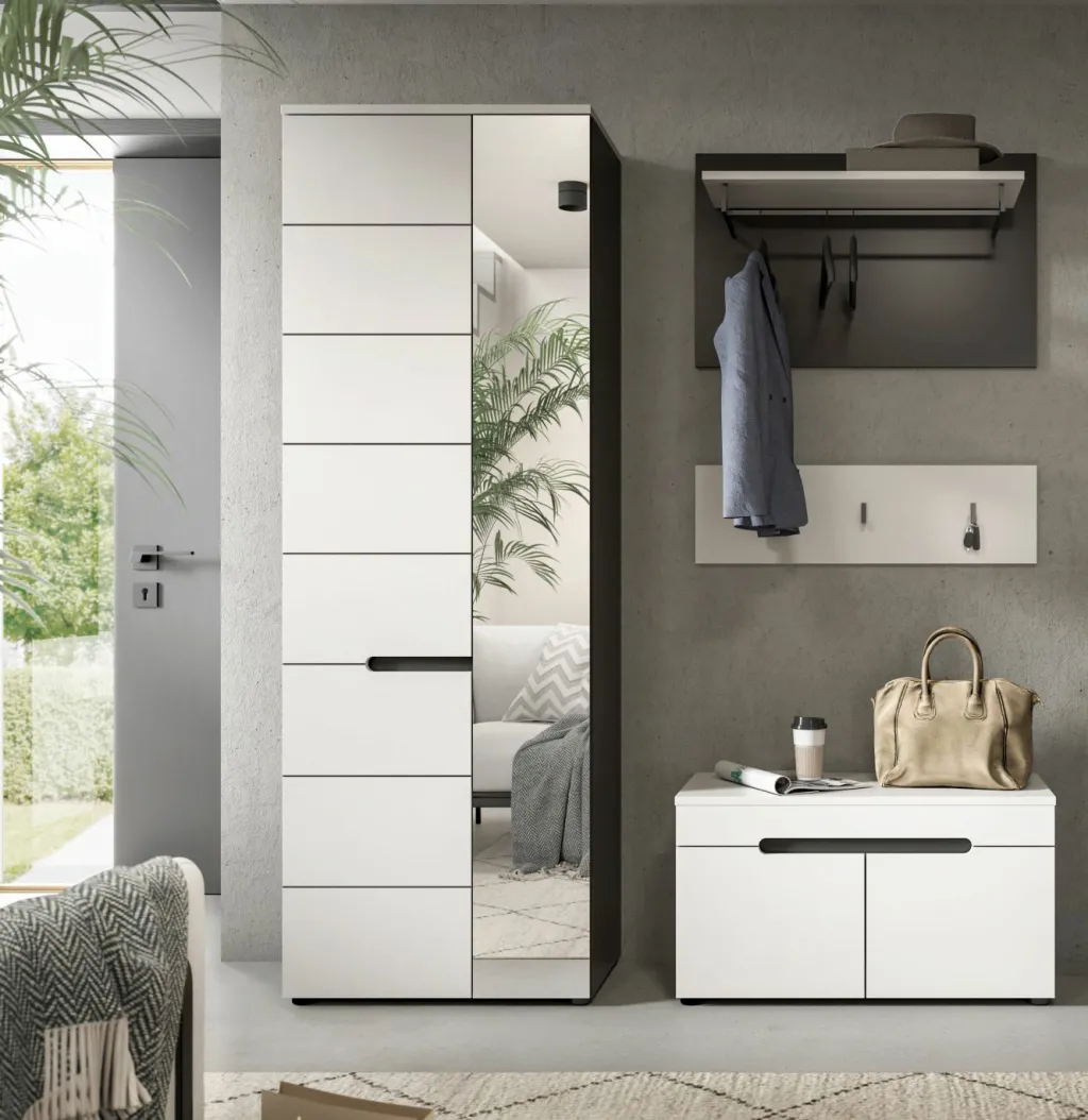 1 armoire d’entrée avec 2 portes (dont 1 porte avec miroir), 1 tablette fixe, 1 barre de penderie et 4 tablettes amovibles