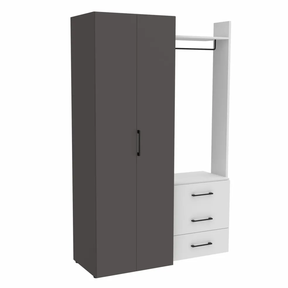 2 portes avec, derrière elles, 1 barre de penderie et 2 tablettes