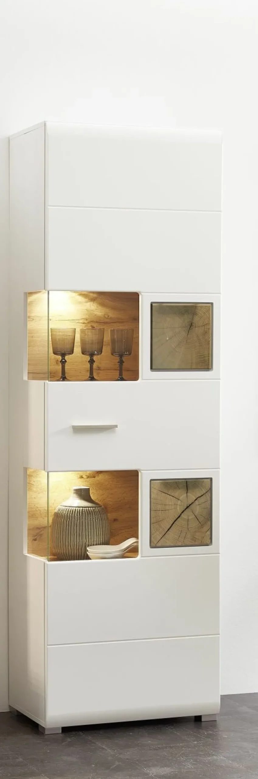 Façade : MDF (panneaux en fibre de bois de densité moyenne) ton blanc ultra brillant avec contrastes décor bois de bout / verre transparent